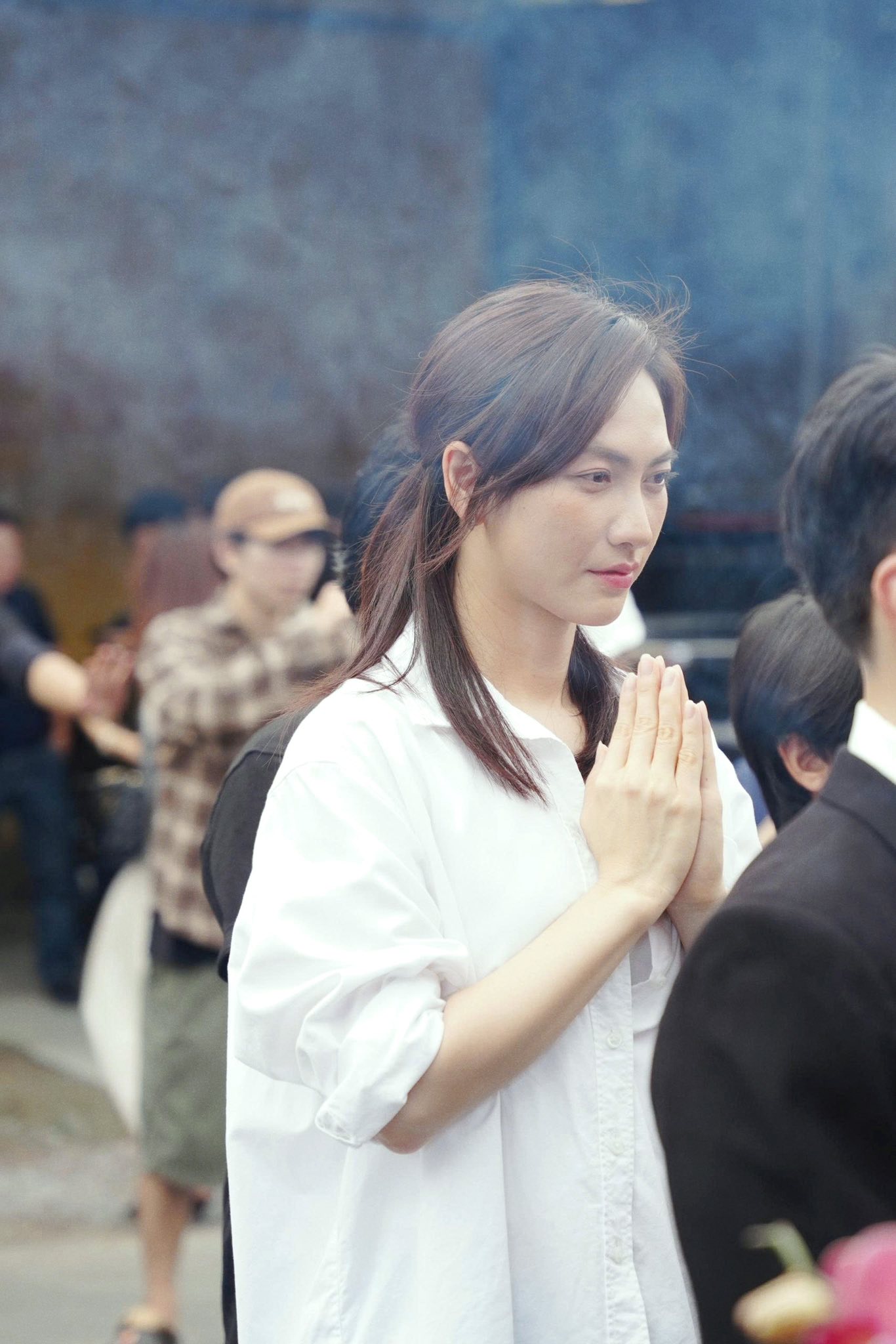 Nam diễn viên Tuấn Trần diện trang phục trắng đơn giản trong buổi khai máy.